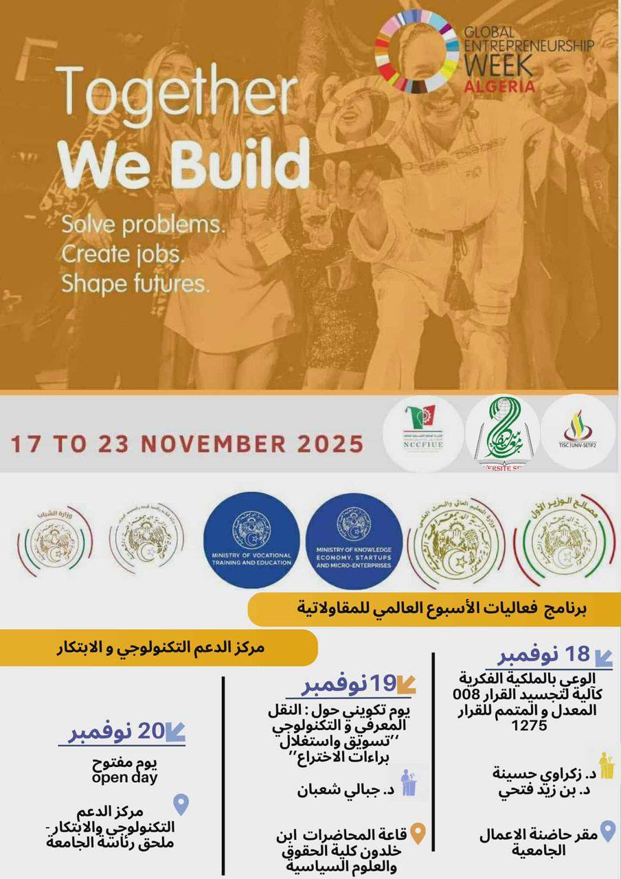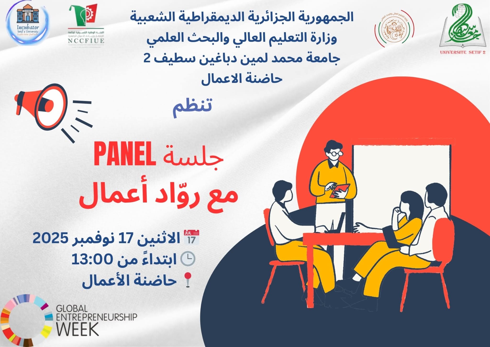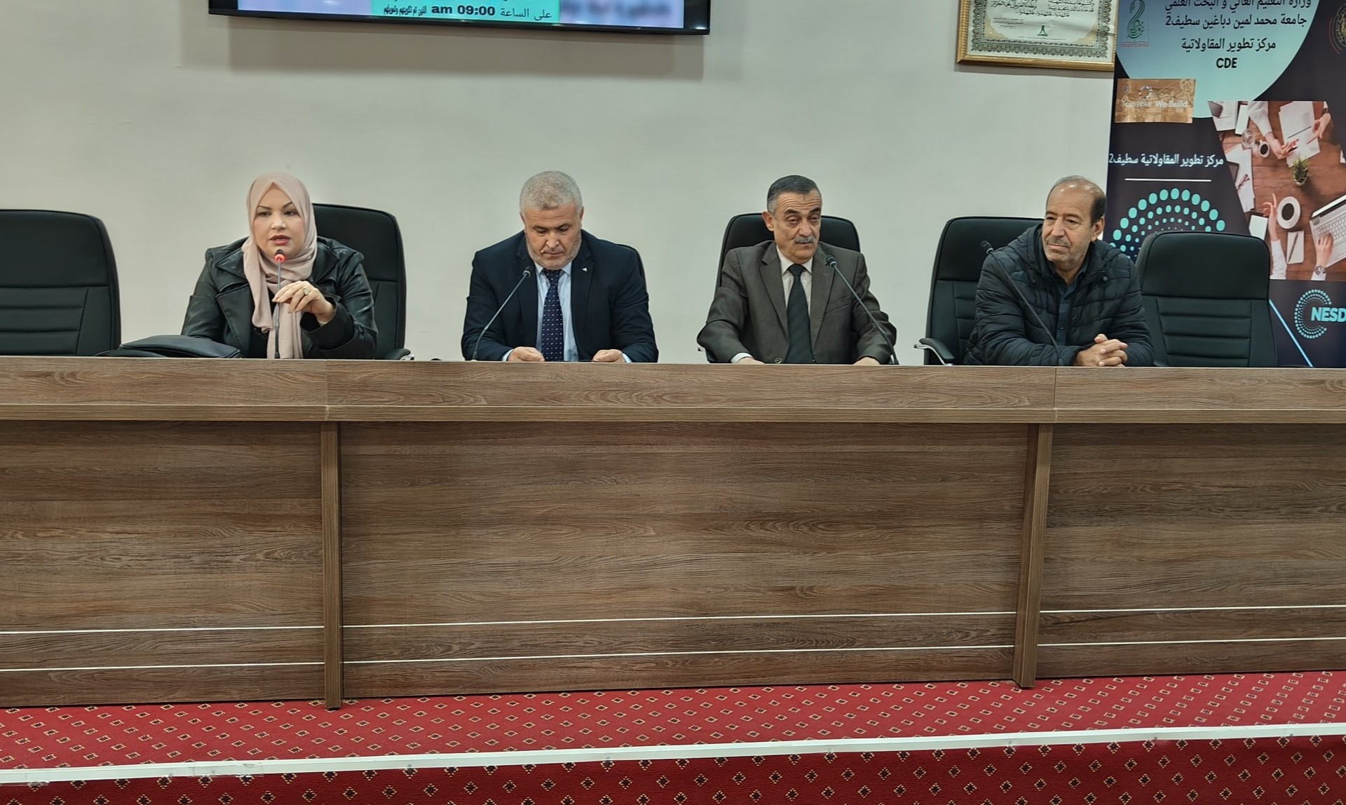 شارك في تأطير المداخلات وورشات التكوين السادة الأساتذة والخبراء المكونين في مجال الابتكار وريادة الأعمال من واجهات الجامعة وإطارات الوكالة الوطنية لترقية وتطوير المقاولاتية لولاية سطيف.