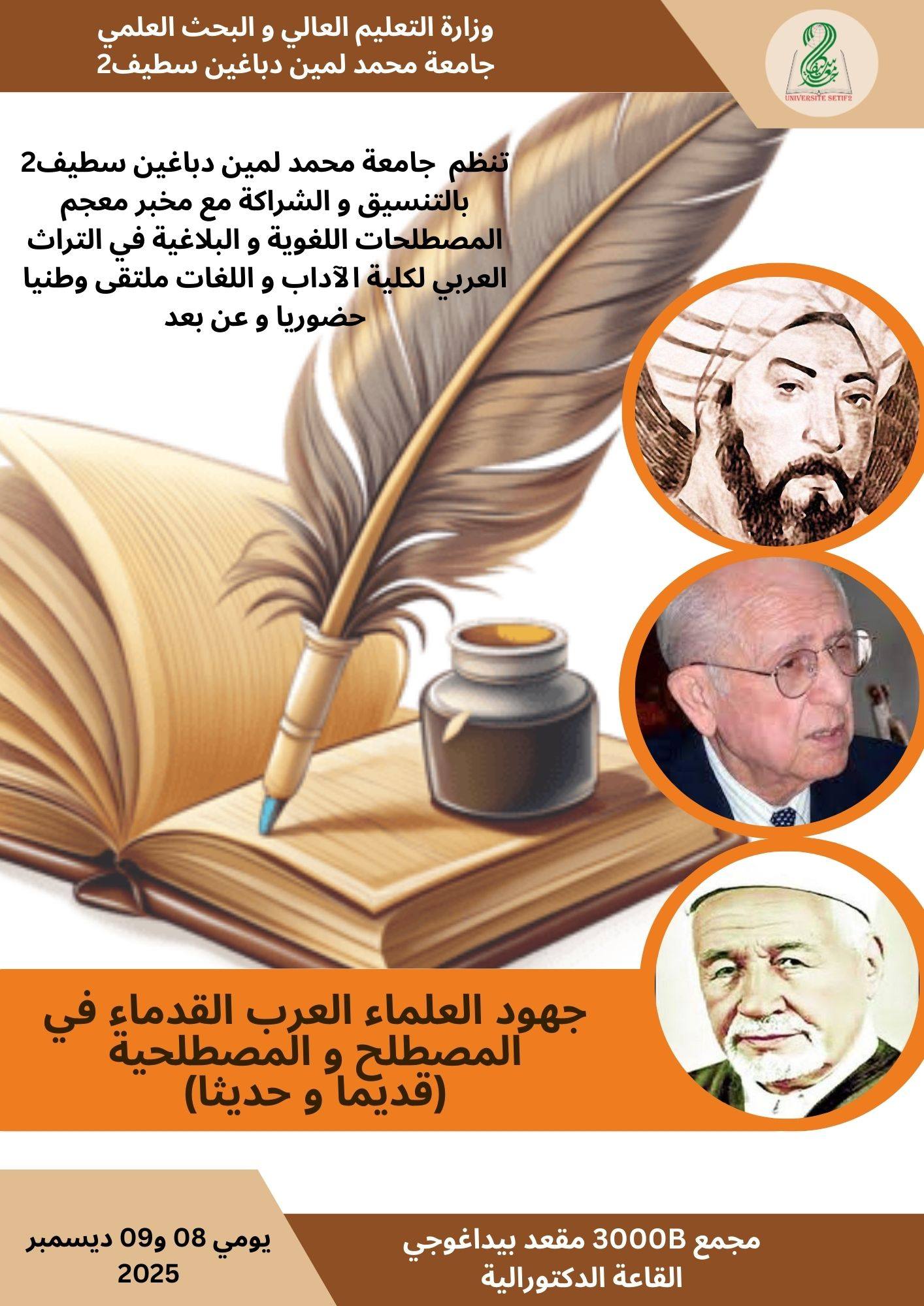 في إطار الأنشطة العلمية التي تنظمها كلية الآداب و اللغات بمناسبة شهر اللغة العربية واحتفاء باليوم العالمي للغة العربية 18 ديسمبر، احتضنت القاعة الدكتورالية للجامعة فعاليات الملتقى الوطني الذي نظمه مخبر معجم المصطلحات اللغوية والبلاغية في التراث العربي تحت عنوان جهود العلماء العرب القدماء في المصطلح والمصطلحية، شهدت فعاليات افتتاح الملتقى حضور ومشاركة أساتذة الكلية ومسؤولو الجامعة، كما عرف مشاركة لأساتذة من خارج الجامعة عبر تقنية التحاضر عن بعد، الجلسات